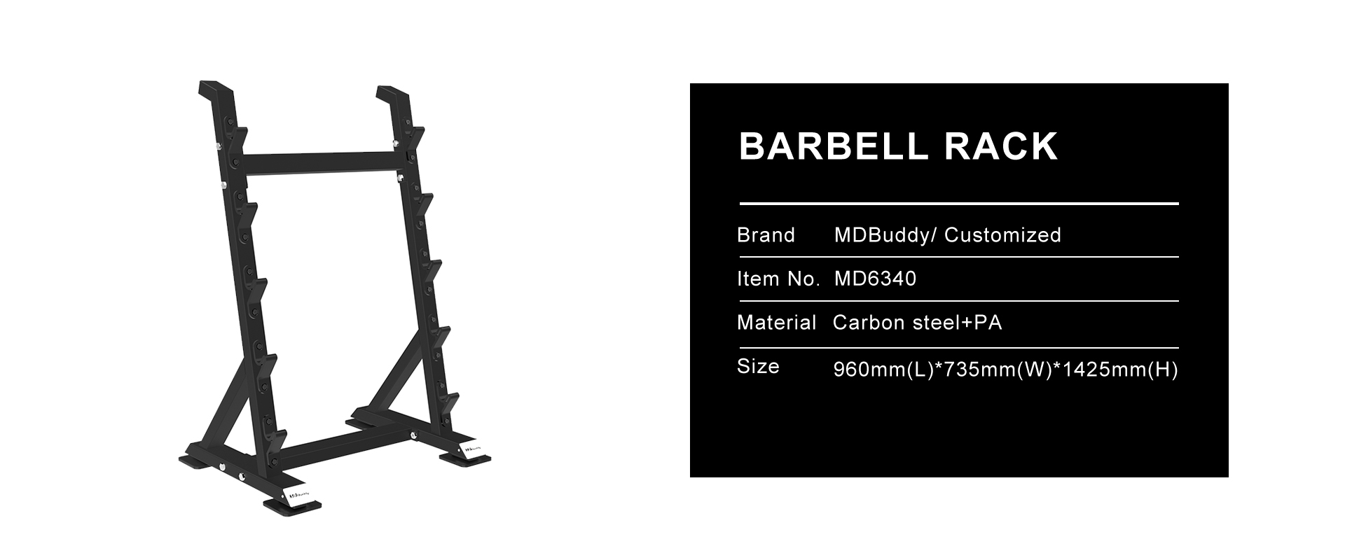 Offering heavy-duty storage, MDBuddy’s barbell storage rack also features a space-saving design. Store your barbells up off the groud now. MDBuddy's storage racks help you maximize your gym, while keep your place in order. The rack is made of heavy-duty steel for durability. We have more than 10 kinds of barbell racks for your choice.