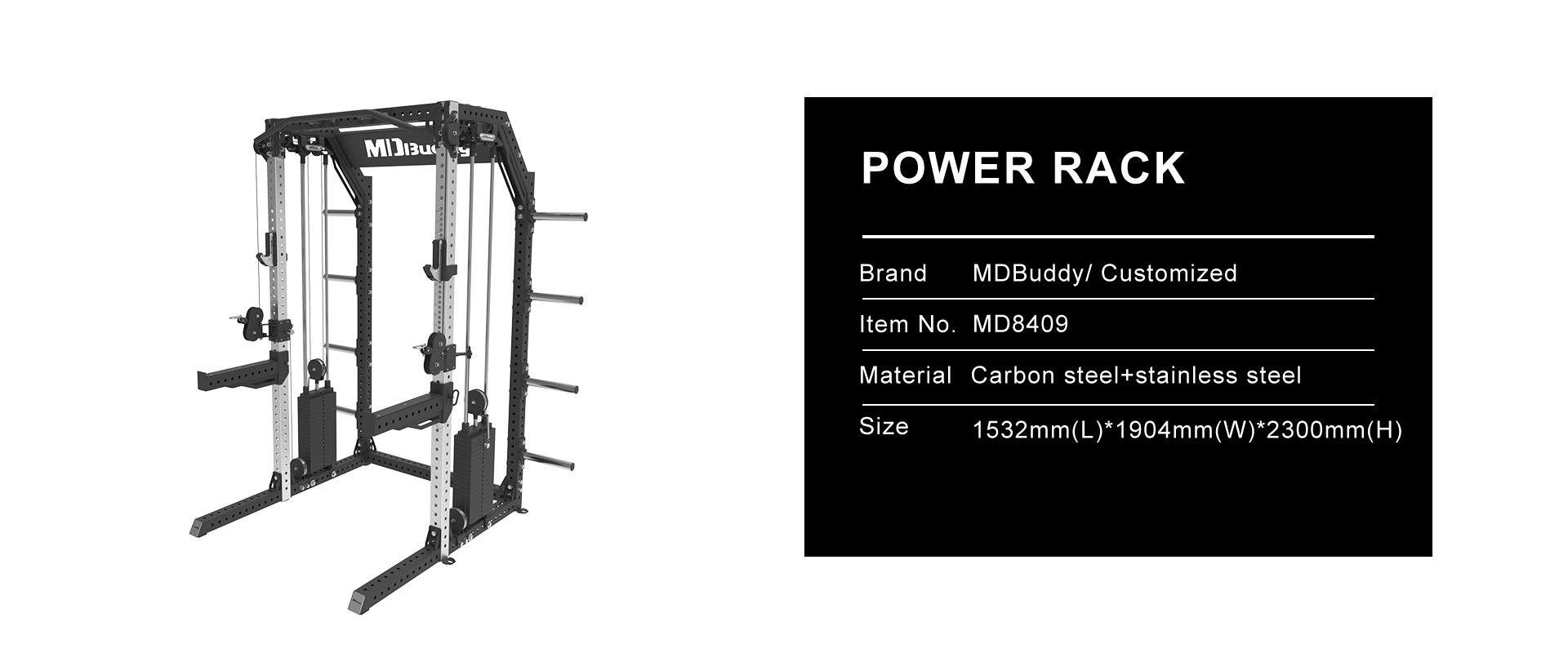 *The main body of this power rack uses high-strength carbon steel tubing, ensuring stable load-bearing capacity and long-term durability. The front upright is made of stainless steel, enhancing corrosion resistance and structural strength in key areas.
